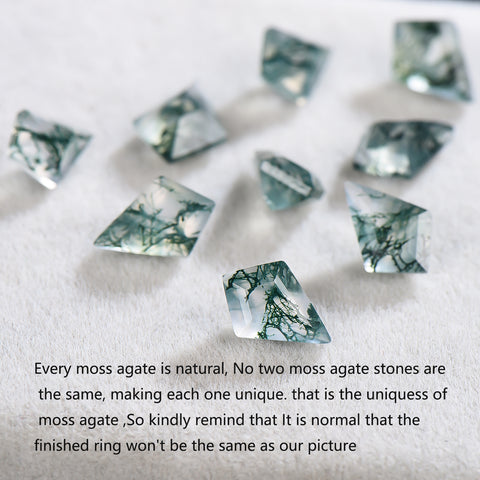 Cutting:Circular, elliptical, or pear-shaped cuts that accentuate the moss agate pattern and add a touch of uniqueness. However, my top pick is the kite-shaped moss agate Engagement ring. The freedom of the kite shape and the elegance of water and grass come together beautifully. It's truly a harmonious blend!