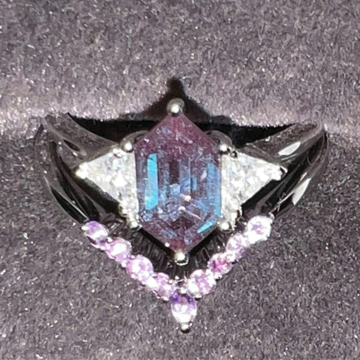 - Main Stone: 5x9mm hexagon cut lab Alexandrite