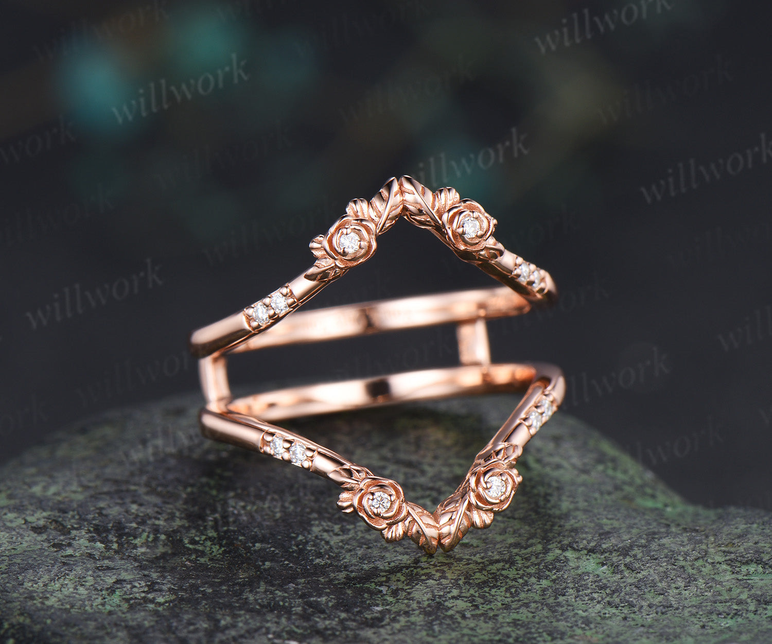 Dainty moissanite floral leaf wedding band double layered enhancer ring stacking ring