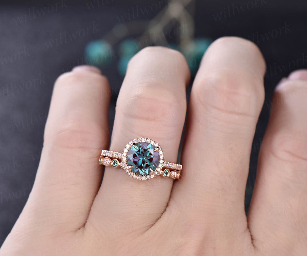 2pcs round 8mm Alexandrite engagement ring set rose gold halo ring natural emerald diamond wedding band vintage wedding bridal ring set gift