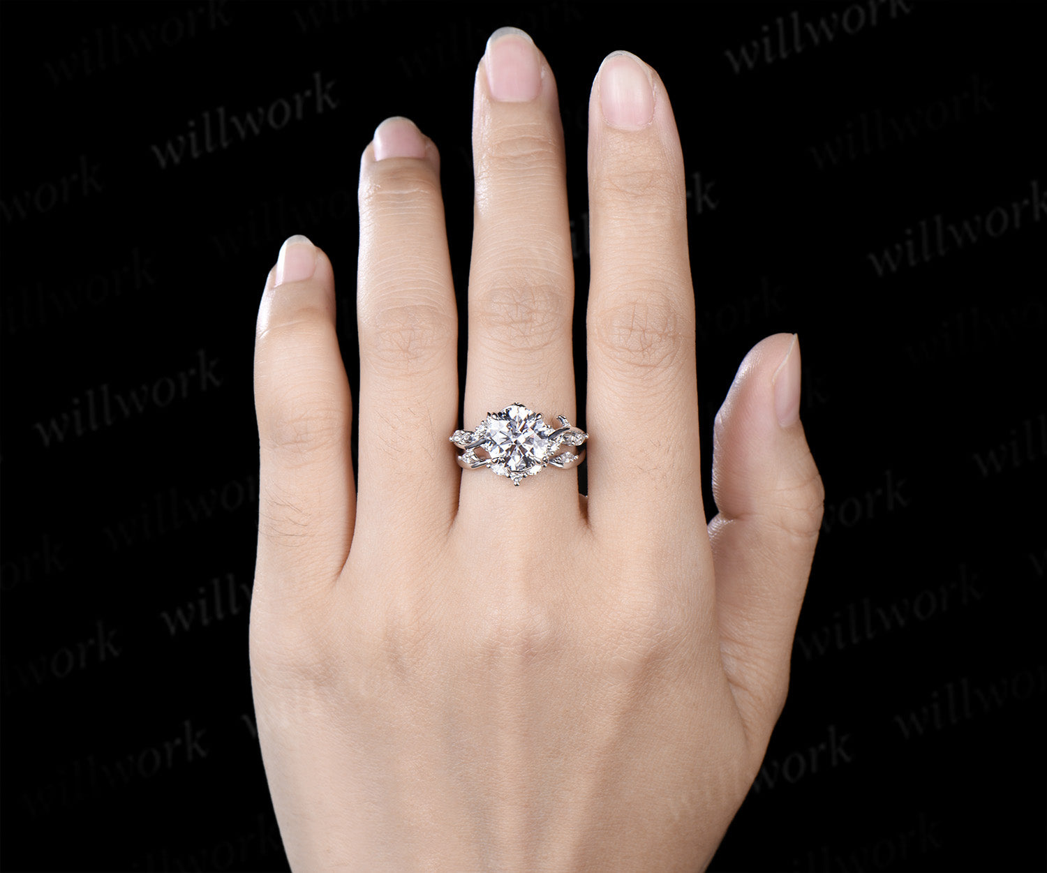 9mm round cut IGI lab grown diamond engagement ring set nature inspired leaf twig diamond bridal set gifts for women