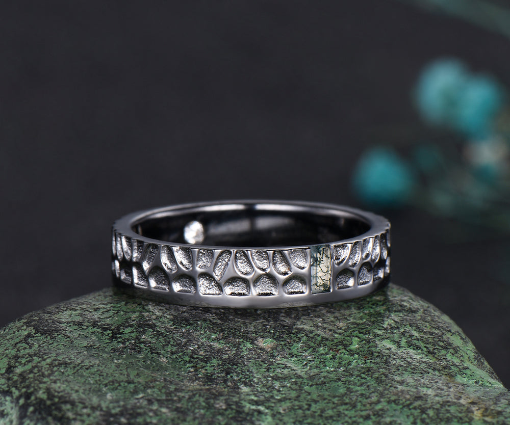 Mens Moss agate Wedding Band Baguette Cut Green Agate Band 5mm Solid Gold Ring Mens Hammered Stacking Matching Band Retro Vintage Ring Gift