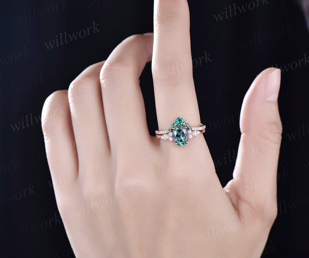 Oval Alexandrite wedding set vintage Alexandrite engagement ring set opal ring set emerald ring set diamond ring set women rose gold ring