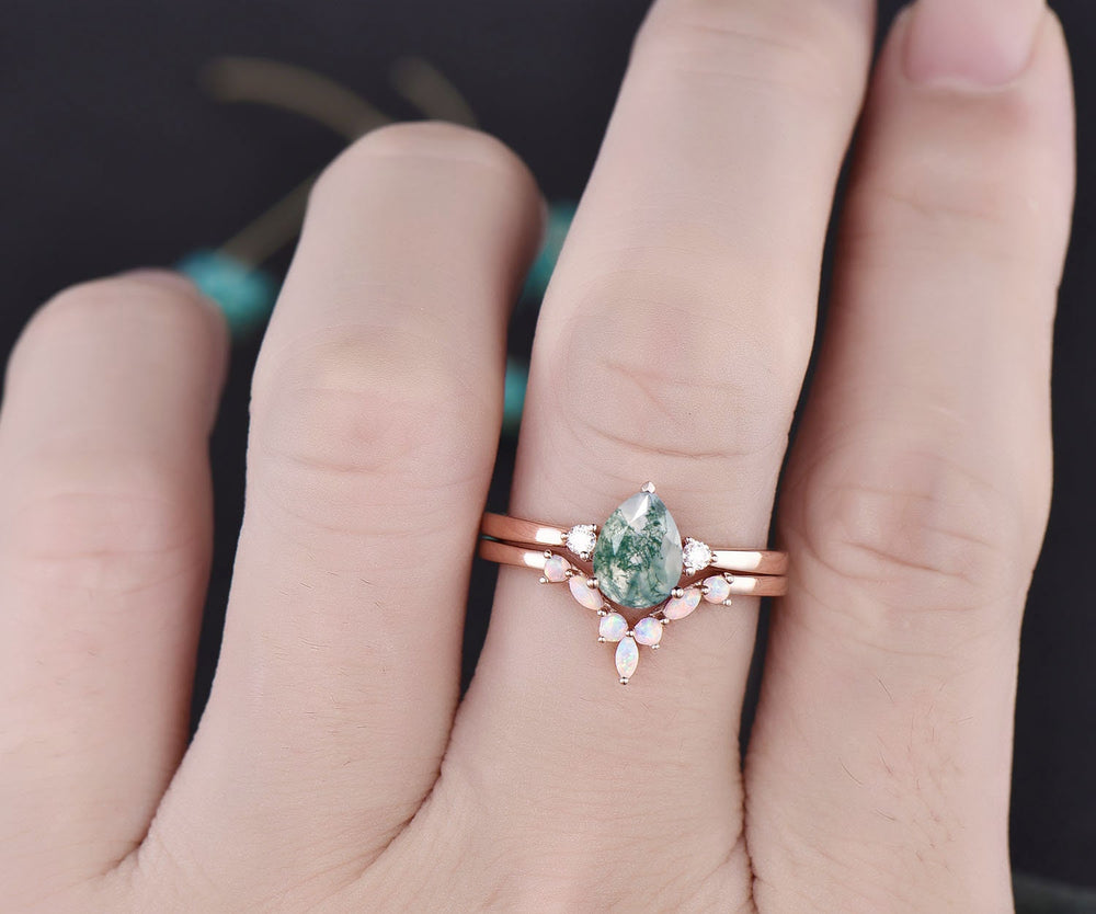 Pear shaped moss agate engagement ring set vintage art deco opal ring set marquise ring set moissanite ring set rose gold ring set jewelry