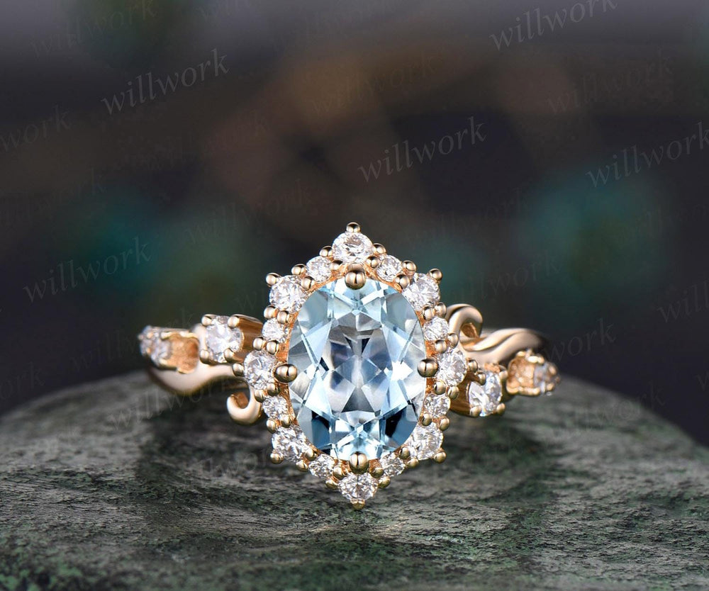 Vintage oval cut aquamarine engagement ring snowdrift halo diamond ring 14k yellow gold March birthstone unique promise ring women jewelry