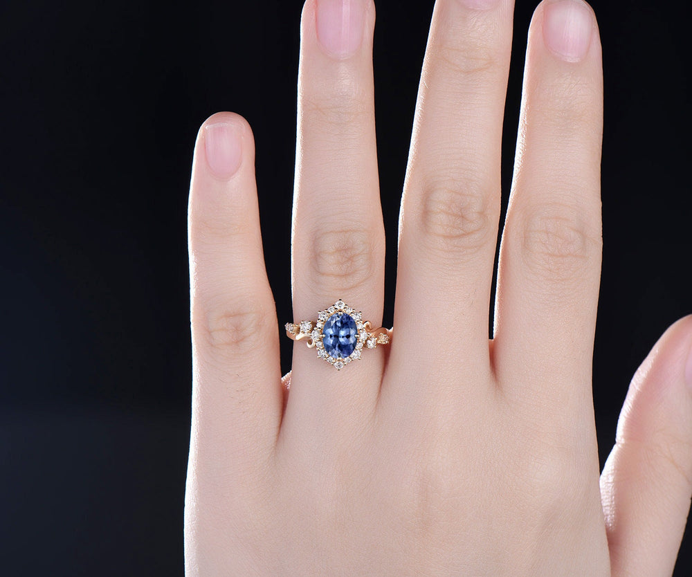 Vintage oval cut Tanzanite engagement ring solid 14k yellow gold snowdrift halo diamond ring unique wedding bridal ring women fine jewelry