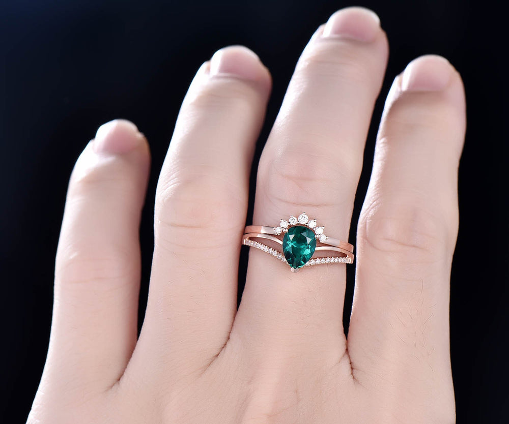 - Main Stone: 6x8mm pear cut Lab treated emerald