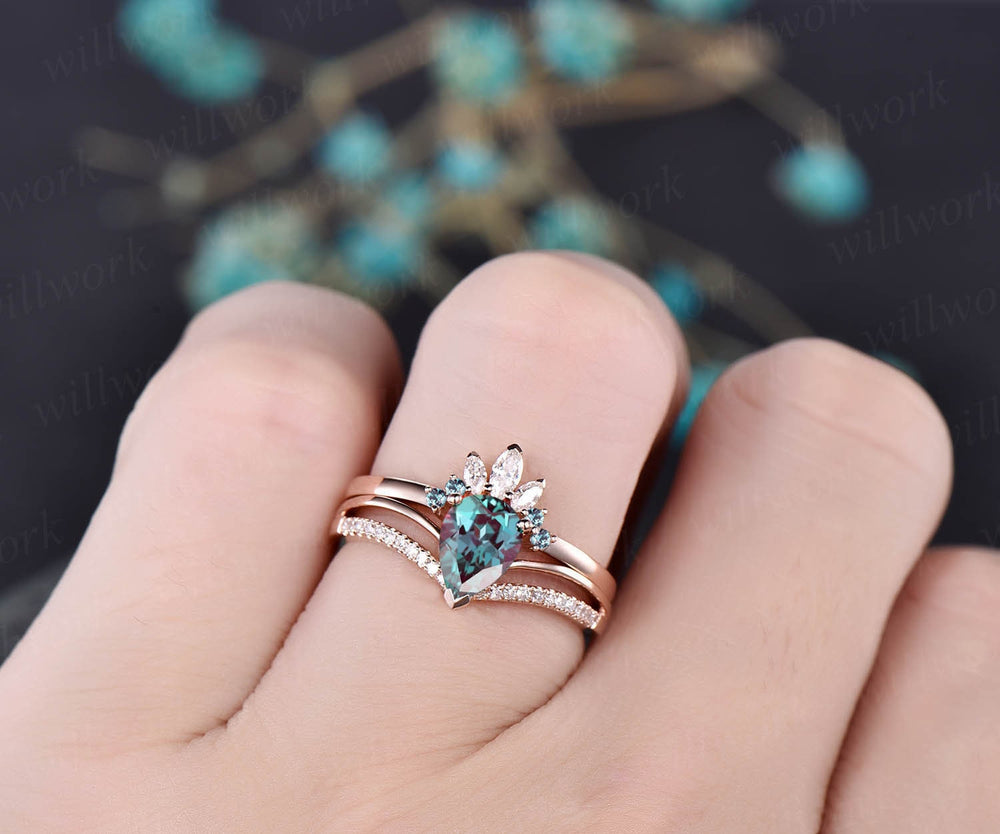 2pcs 6x8mm pear Alexandrite wedding bridal set unique vintage alexandrite engagement ring set rose gold marquise crown moissnaite ring band