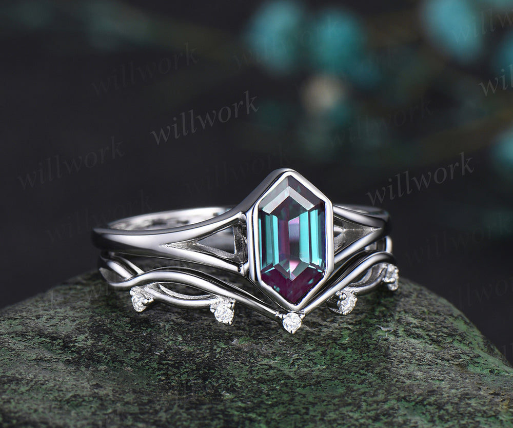 Long hexagon cut alexandrite Engagement Ring Set Solitaire split shank white gold ring vintage infinity wedding Anniversary gift