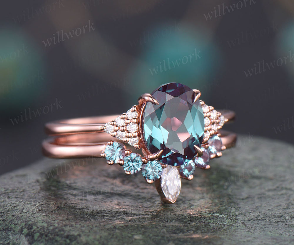 Oval Alexandrite engagement ring set vintage rose gold moissanite bridal ring set custom art deco ring unique gift crown ring women jewelry