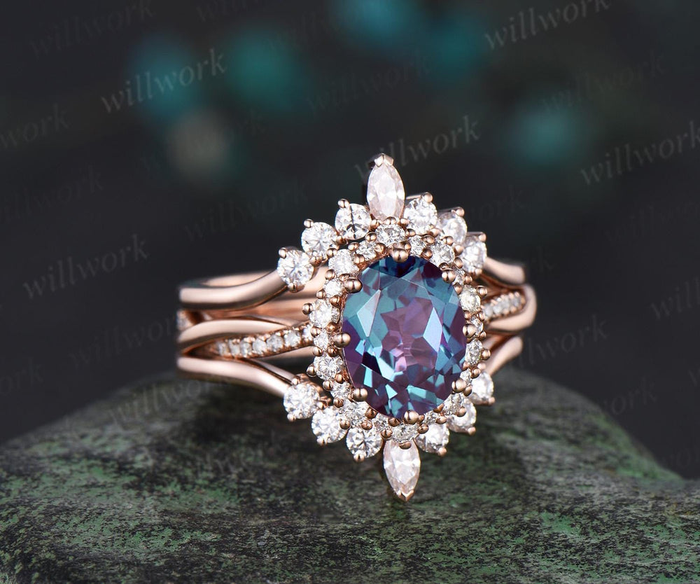 Oval cut alexandrite engagement ring set 14k rose gold infinity snowdrift halo moissanite ring women unique bridal anniversary gift jewelry