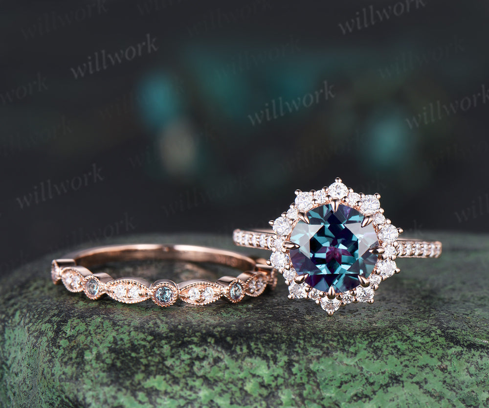 Round cut Alexandrite engagement ring set rose gold milgrain halo half eternity snowdrift diamond ring women unique moissanite bridal ring set