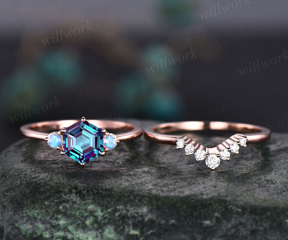 Unique Alexandrite moonstone engagement ring set rose gold hexagon cut ring three stone minimalist ring moissanite bridal ring set women