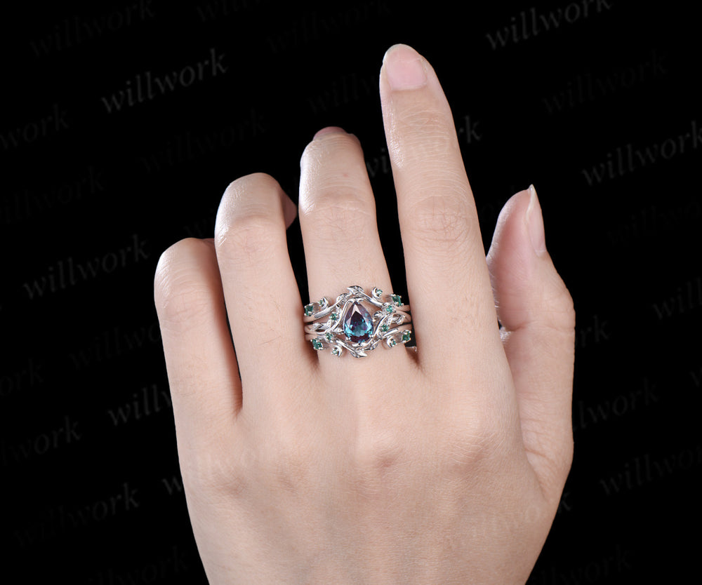 Vintage pear alexandrite engagement ring set leaf twig art deco emerald ring double layer emerald enhancer band unique brial set