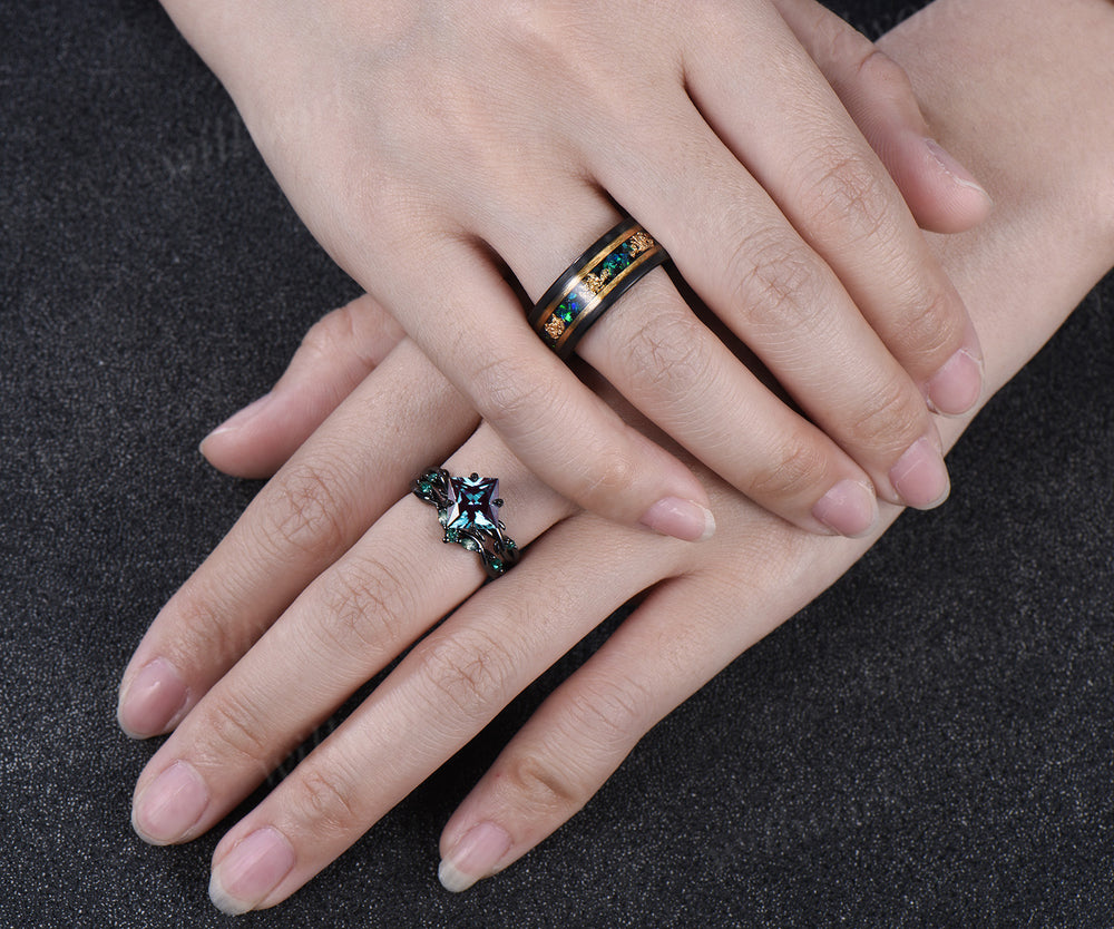 ***Step into a storybook romance with this nature-kissed couple ring set. A princess cut alexandrite shimmers atop a vintage-inspired twig and leaf band, while the tungsten men's ring is infused with mesmerizing black opals and gold flakes. A striking symbol of wild love and lasting devotion.***