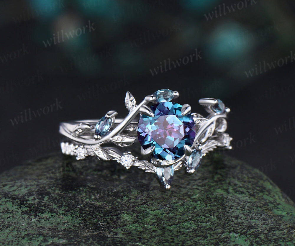 1ct round cut alexandrite ring vintage leaf unique nature inspired engagement ring set women white gold June birthstone ring gift