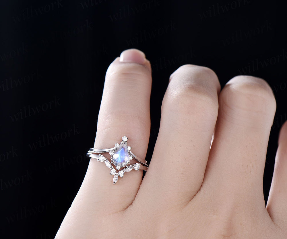 2pcs pear moonstone ring gold vintage moonstone engagement ring set white gold June birthstone ring cluster moissanite ring bridal set gift