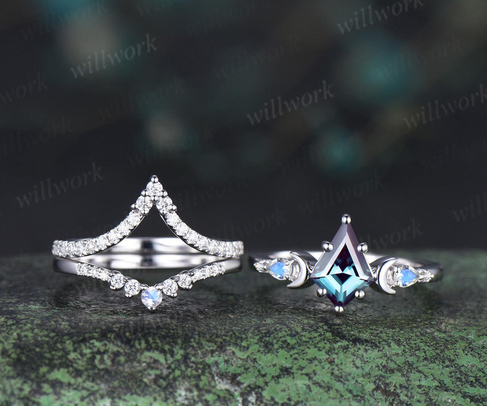 3pc kite cut Alexandrite ring vintage white gold moon five stone engagement ring set moonstone diamond unique wedding promise ring women