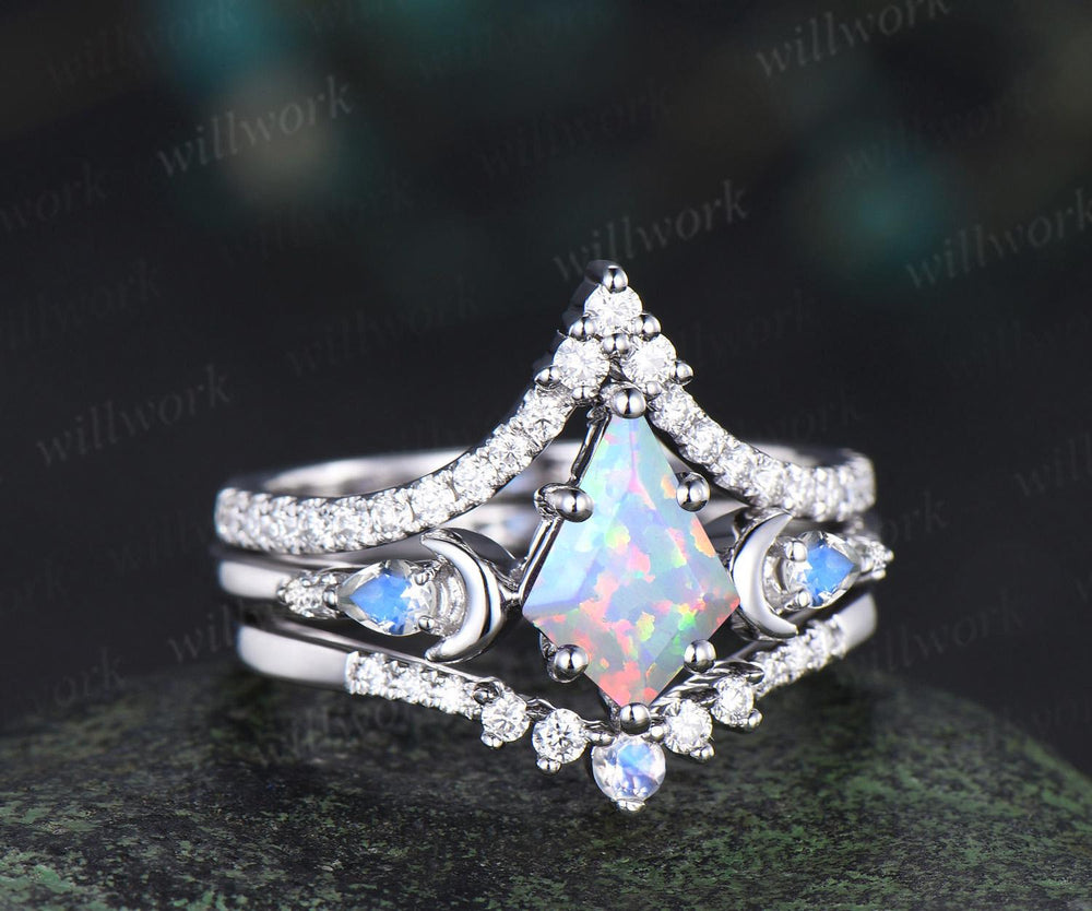3pc kite cut opal ring vintage white gold moon five stone engagement ring set moonstone diamond unique wedding bridal ring set gift women
