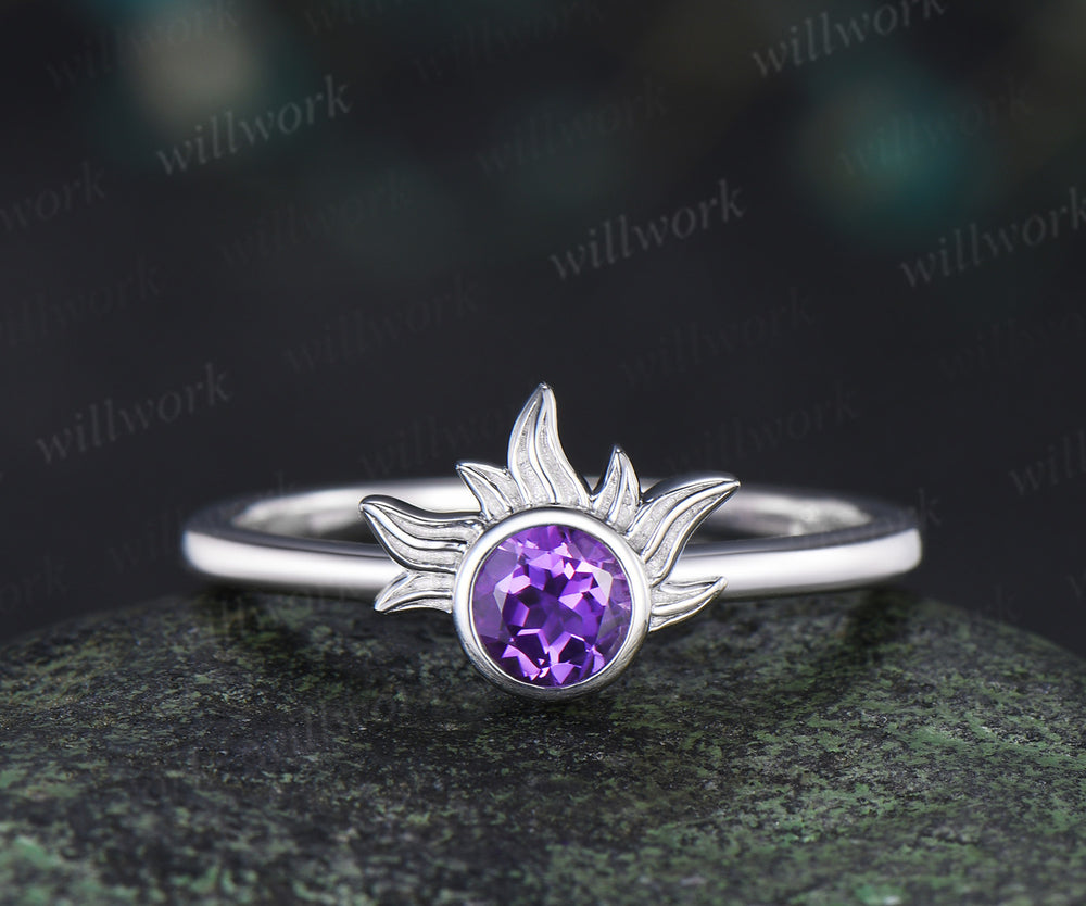 ***Celebrate love with this unique couple ring set, featuring a 4mm round amethyst sun ring for her and a matching sun hollow out polished comfort-fit band for him. The radiant sun design symbolizes warmth and devotion, making it an ideal gift for anniversaries, weddings, or everyday wear.***- Metal: Solid gold(10K/14K/18K white/yellow/rose gold),925 sterling silver,platinum available