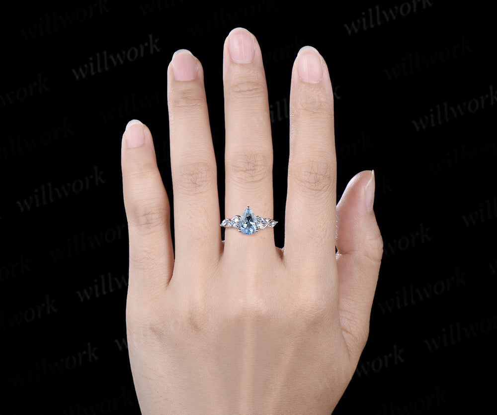 ***Elegant and serene, this 6x8mm pear cut aquamarine engagement ring sparkles with marquise aquamarines and shimmering moissanite in a radiant cluster design. A timeless promise ring and meaningful March birthstone jewelry gift, symbolizing love, purity, and new beginnings***- Metal: Solid gold(10K/14K/18K white/yellow/rose gold),925 sterling silver,platinum available