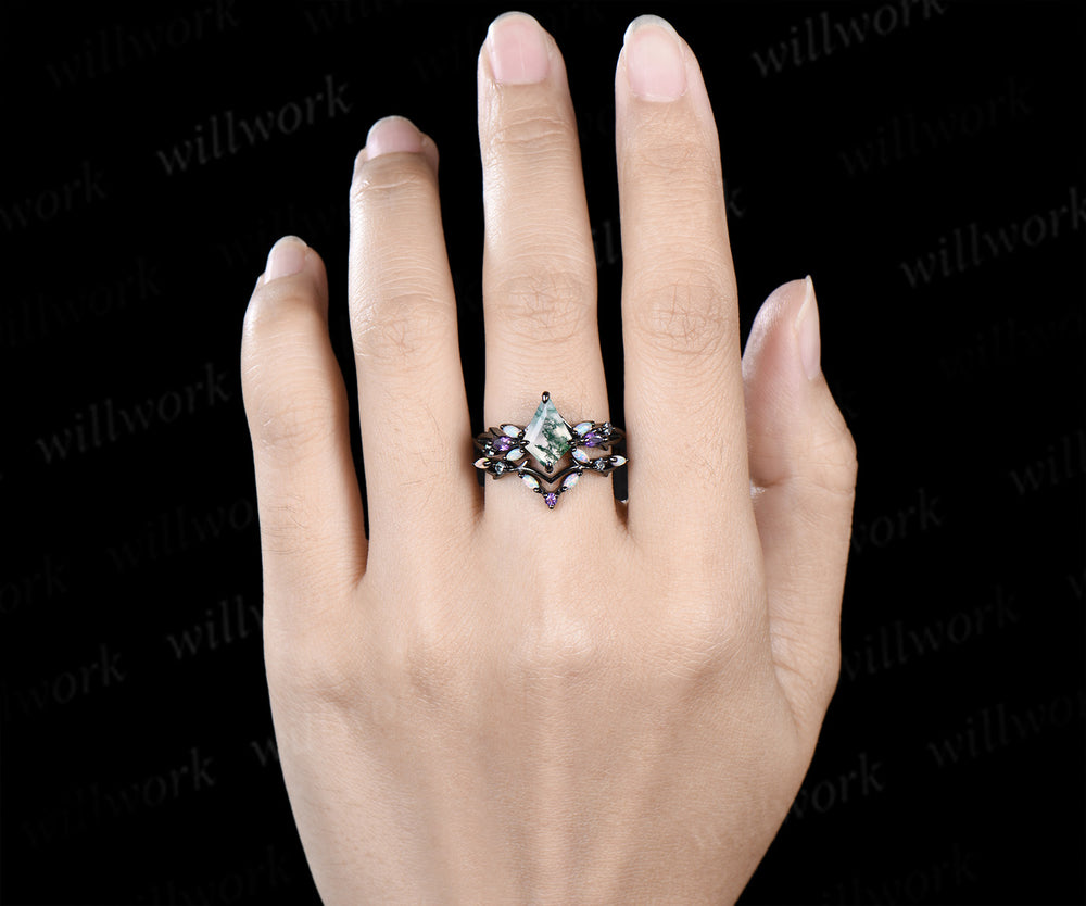 ***Ethereal and romantic, this kite cut moss agate engagement ring set is nature captured in jewelry. The vintage twig branch band embraces a 7x10mm moss agate, accented with opal, amethyst, and alexandrite. Available in classic silver, gold or bold black gold, it symbolizes love, growth, and eternity¨•an enchanting and unique bridal set for her.***- Metal: Solid gold(10K/14K/18K white/yellow/rose gold),925 sterling silver,platinum available