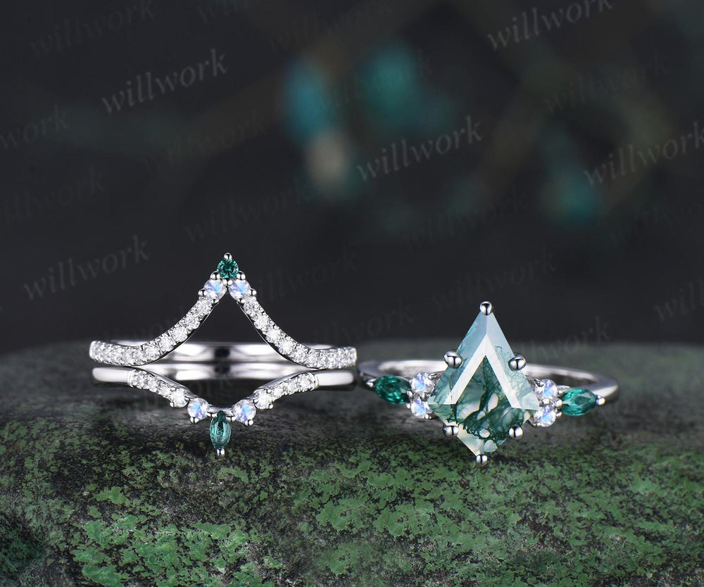 8x11mm kite cut green moss agate engagement ring set moonstone moissanite emerald ring bridal set white gold ring women