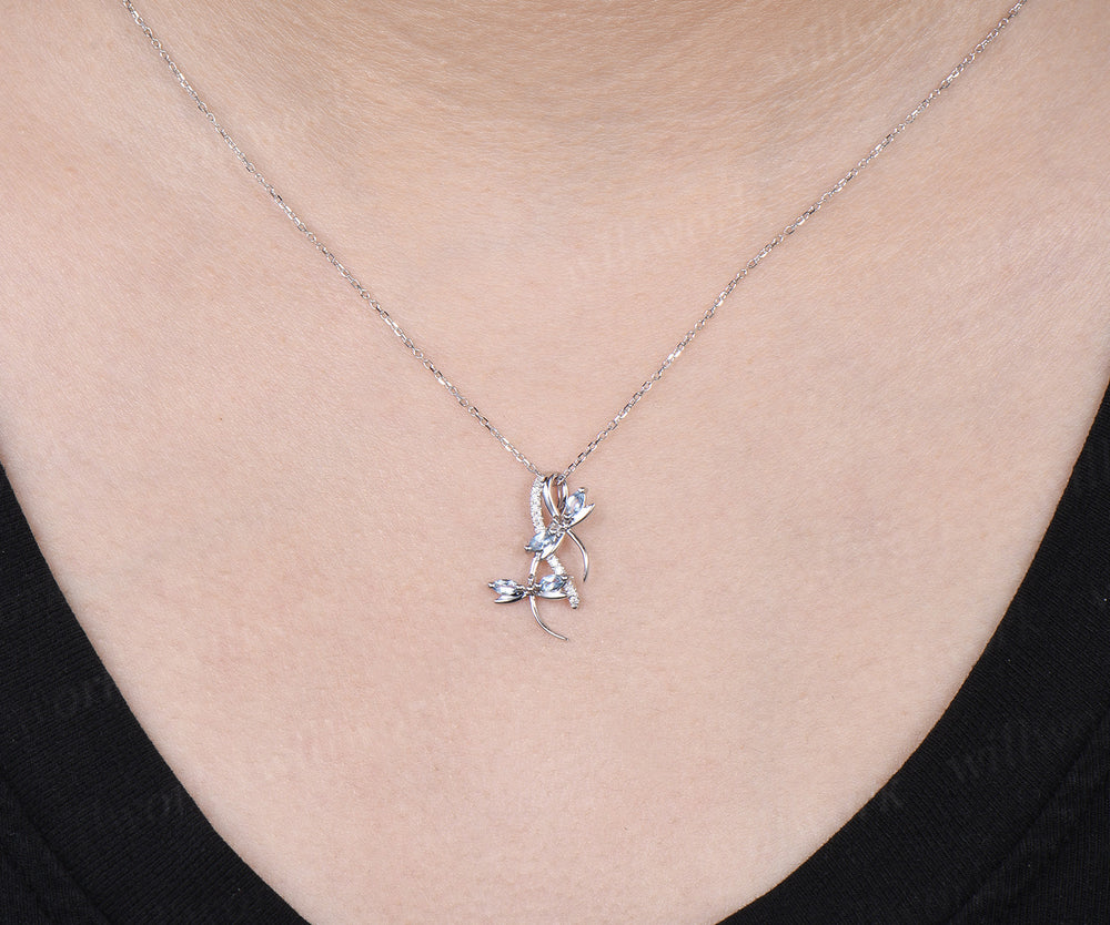 Aquamarine pendant necklace Elegant marquise aquamarine double dragonfly necklace moissanite accented pendant gifts for her