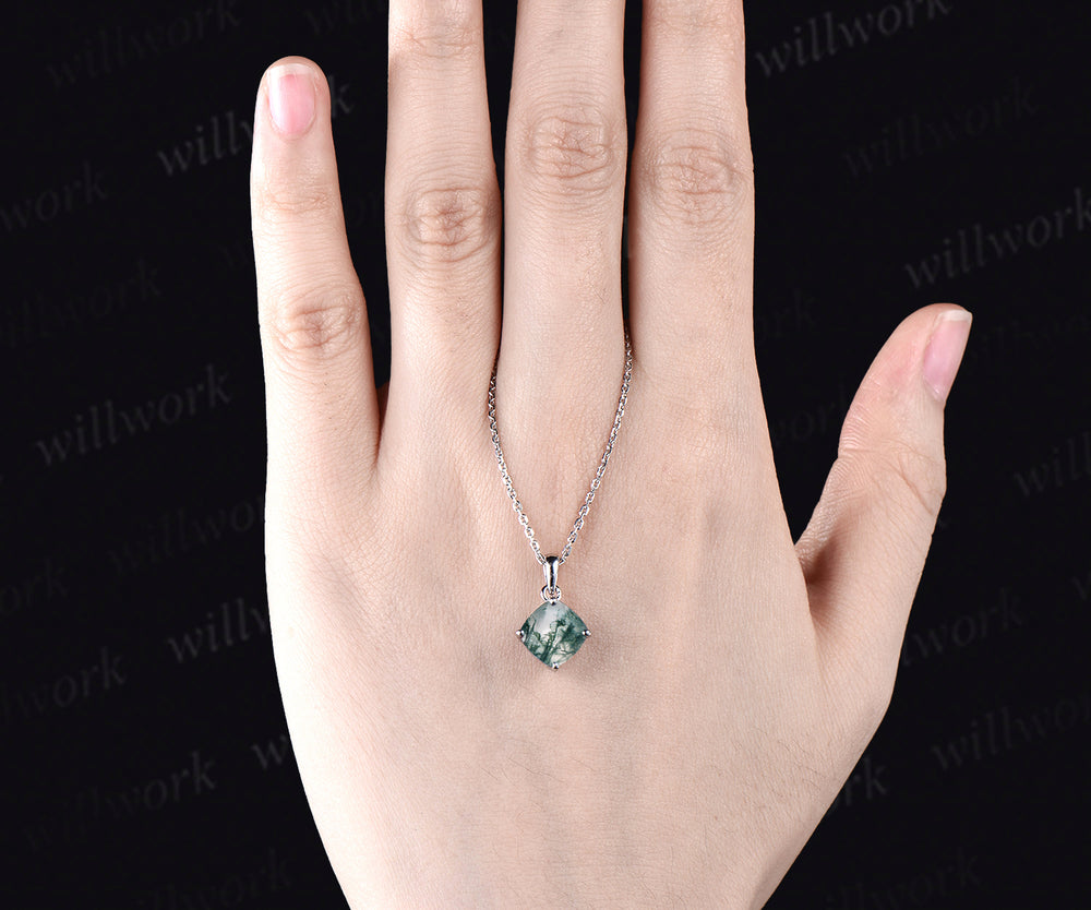 Cushion cut Natural Green Moss Agate Necklace solid 14k white gold square cut Solitaire Pendant Minimalist anniversary gift