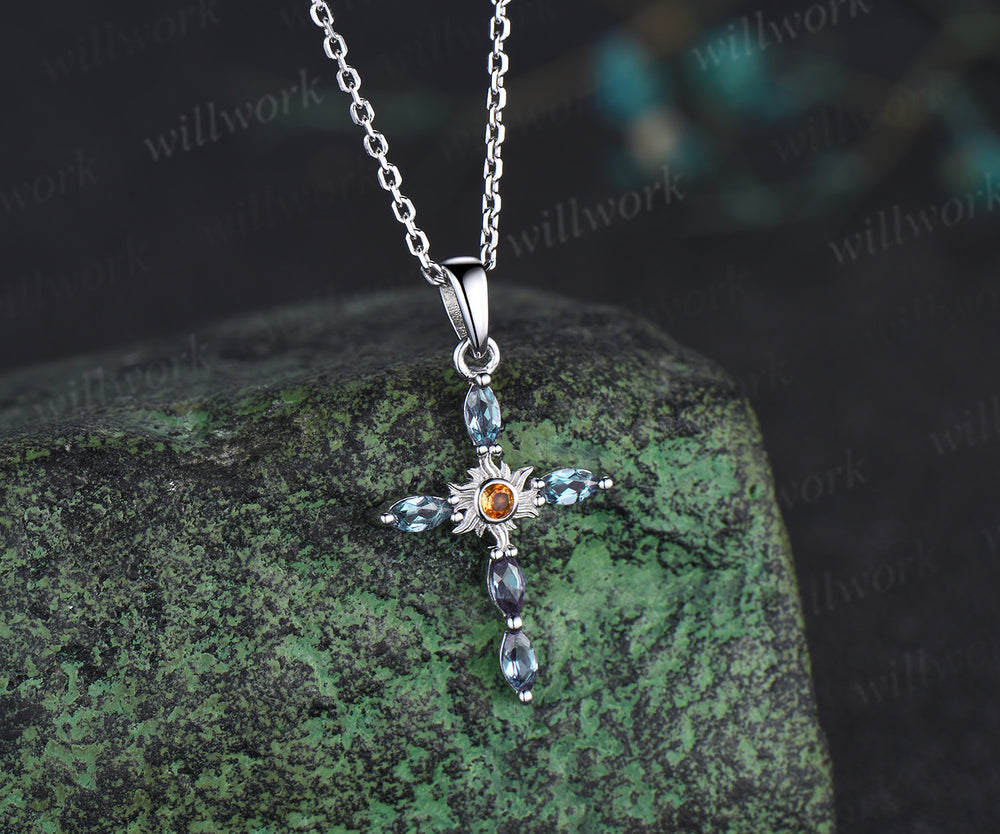 Dainty cross citrine pendant necklace marquise alexandrite deco sun cross necklace sterling silver white gold charm