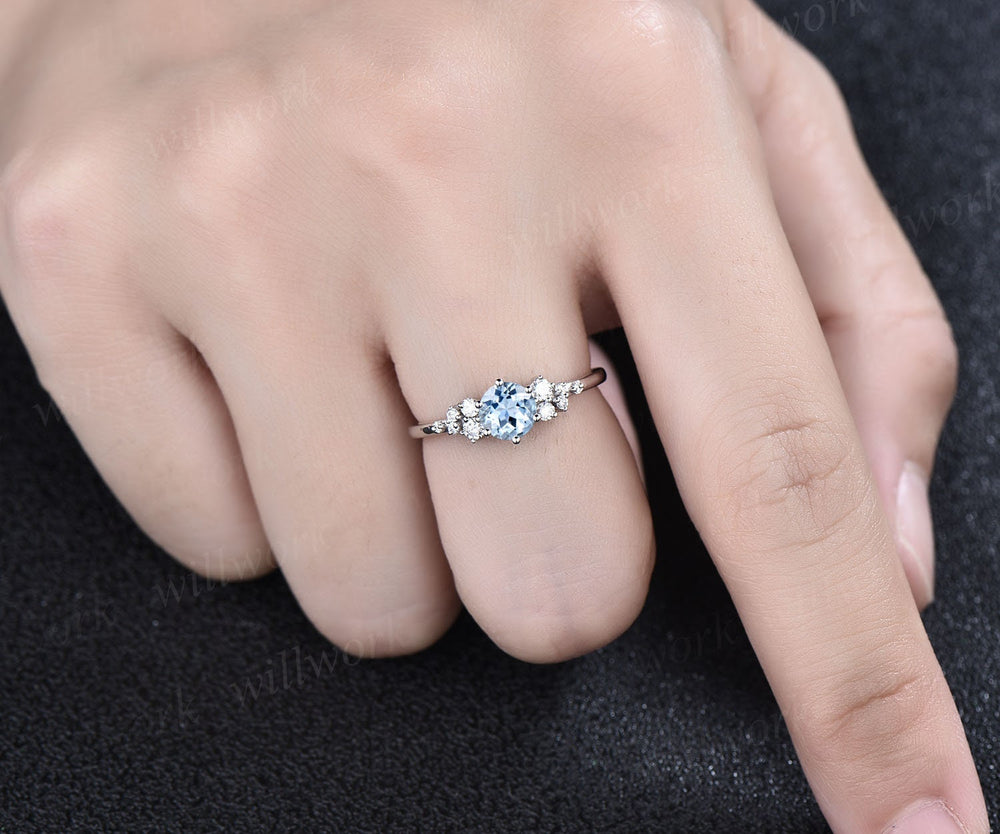 Dainty round aquamarine ring gold vintage aquamarine engagement ring white gold unique snowdrift engagement ring diamond ring women gifts