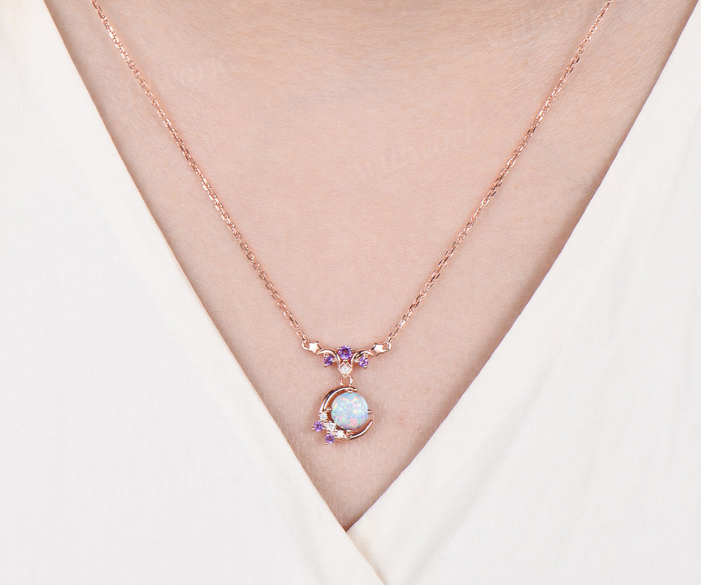 Dainty round opal moon stars necklace amethyst moissanite cluster pendant October birthstone jewelry anniversary gifts