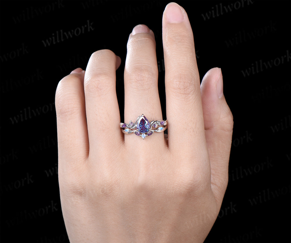 Fireworks cut Alexandrite ring white gold nature inspired bridal ring set leaf amethyst moonstone band gifts for her