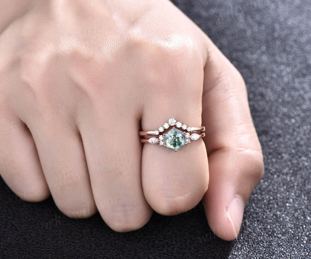 Green moss agate ring set gold silver vintage hexagon moss agate engagement ring set art deco ring women 7 stone moissanite wedding ring set