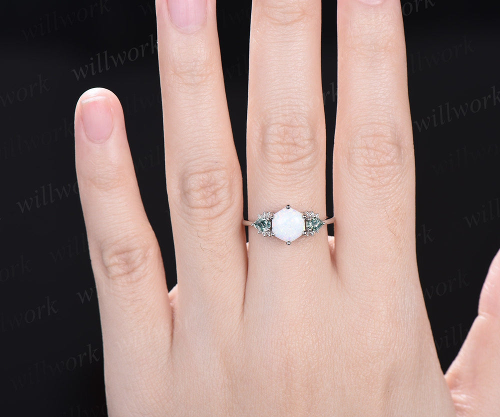 Hexagon white opal ring vintage pear moss agate ring 14k white gold 6 prong unique engagement ring women dainty anniversary ring gift