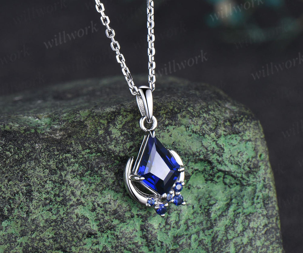 Kite blue sapphire necklace solid 14k 18k white gold vintage unique cluster moon pendant women her gemstone anniversary bridal gift mother