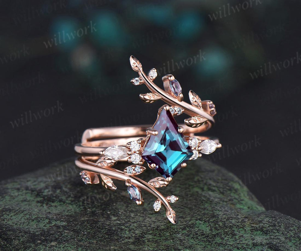 Kite cut alexandrite engagement ring 14k rose gold leaf nature inspired cluster diamond wedding band enhancer unique wedding ring set women