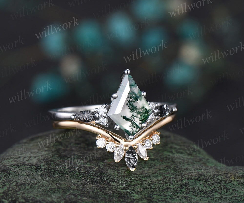 Kite cut green moss agate engagement ring white gold black rutilated quartz ring women unique diamond promise wedding ring set jewelry