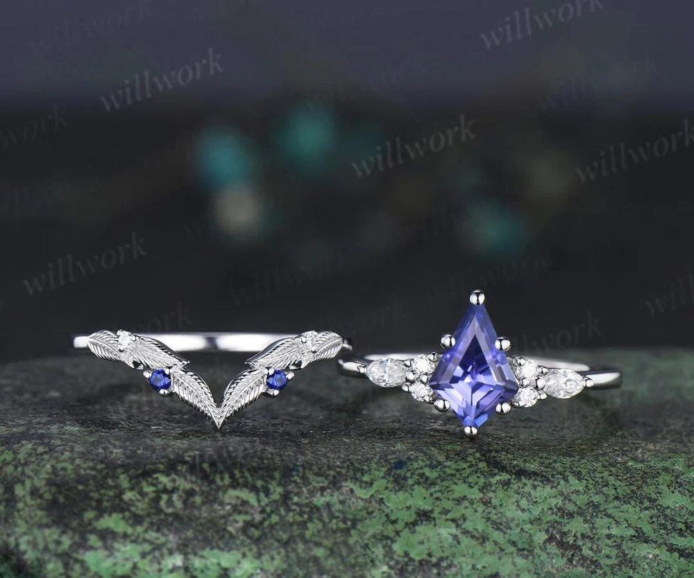 Kite cut tanzanite engagement ring set sapphire moissanite vintage 14k white gold ring leaf nature inspired wedding band bridal set gift