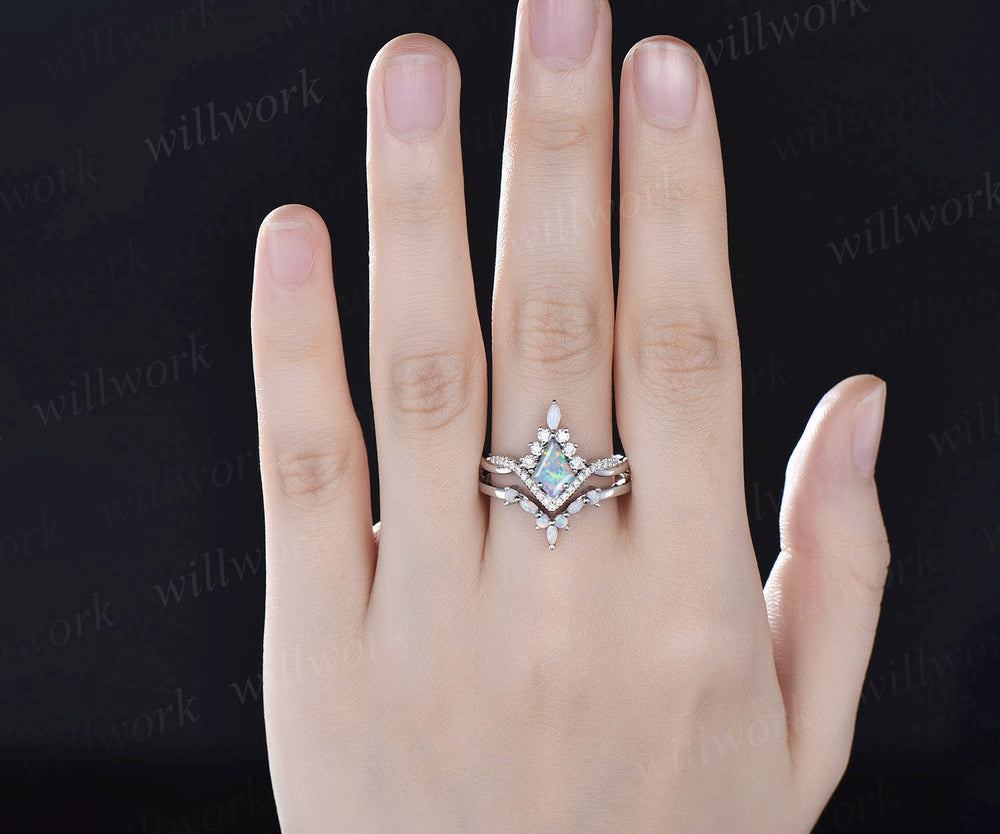 Kite cut white opal engagement ring set art deco 14k white gold halo marquise cut opal ring set twisted moissanite bridal ring set for women