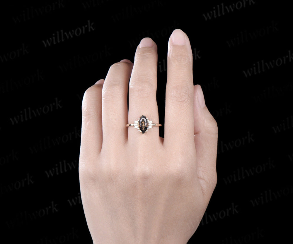 Marquise cut smoky quartz engagement ring solid 14k yellow gold cluster Baguette cut moissanite wedding anniversary ring women gift