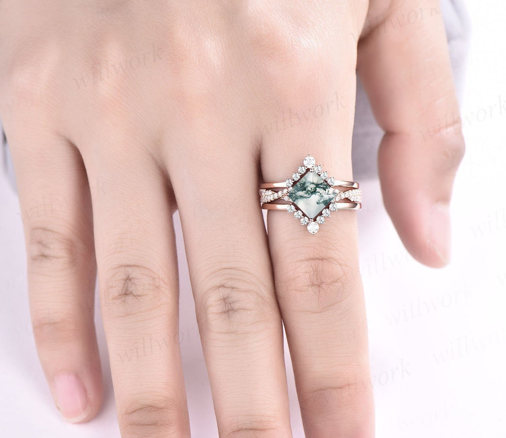 Moss agate ring vintage unique princess cut green moss agate engagement ring set rose gold twisted diamond promise wedding ring set women