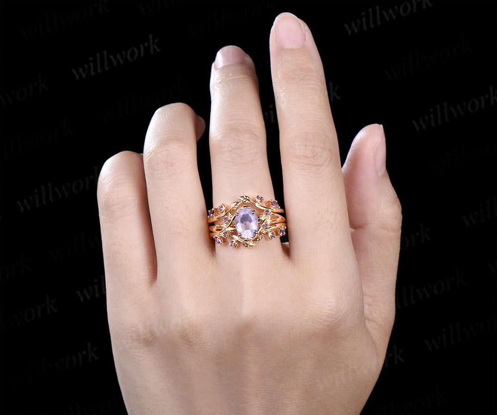 Oval lavender amethyst engagement ring set leaf twig amethysts ring marquise amethyst moon enhancer wraps unique bridal set