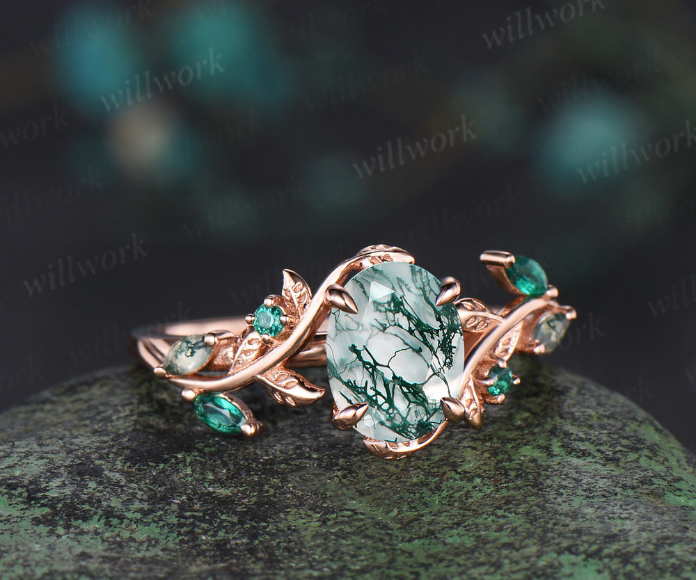 Oval cut moss agate ring rose gold leaf moss agate ring vintage branch Nature Inspired unique Engagement Ring women jewelry