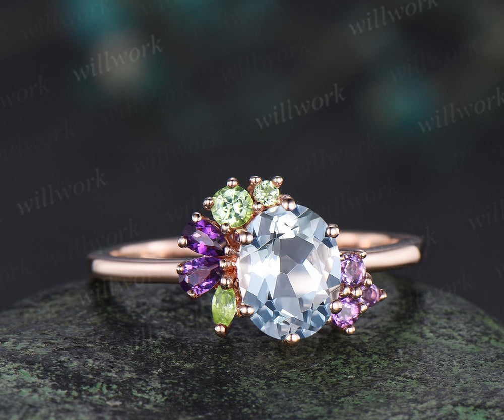 Oval cut natural aquamarine engagement ring 14k rose gold 6 prong cluster amethyst peridot ring dainty wedding promise ring women