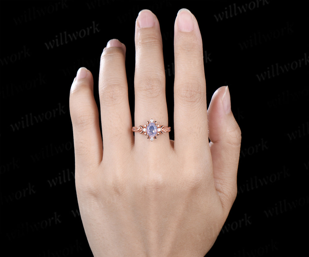 Oval lavender amethyst engagement ring moon star moissanite leaf ring nature inspired promise ring for women