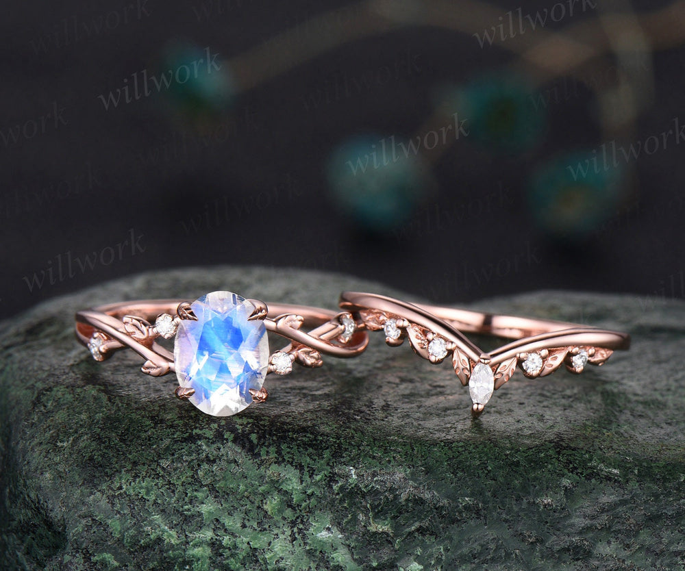Oval moonstone ring vintage twisted leaf nature inspired engagement ring women five stone diamond anniversary bridal wedding ring set gift
