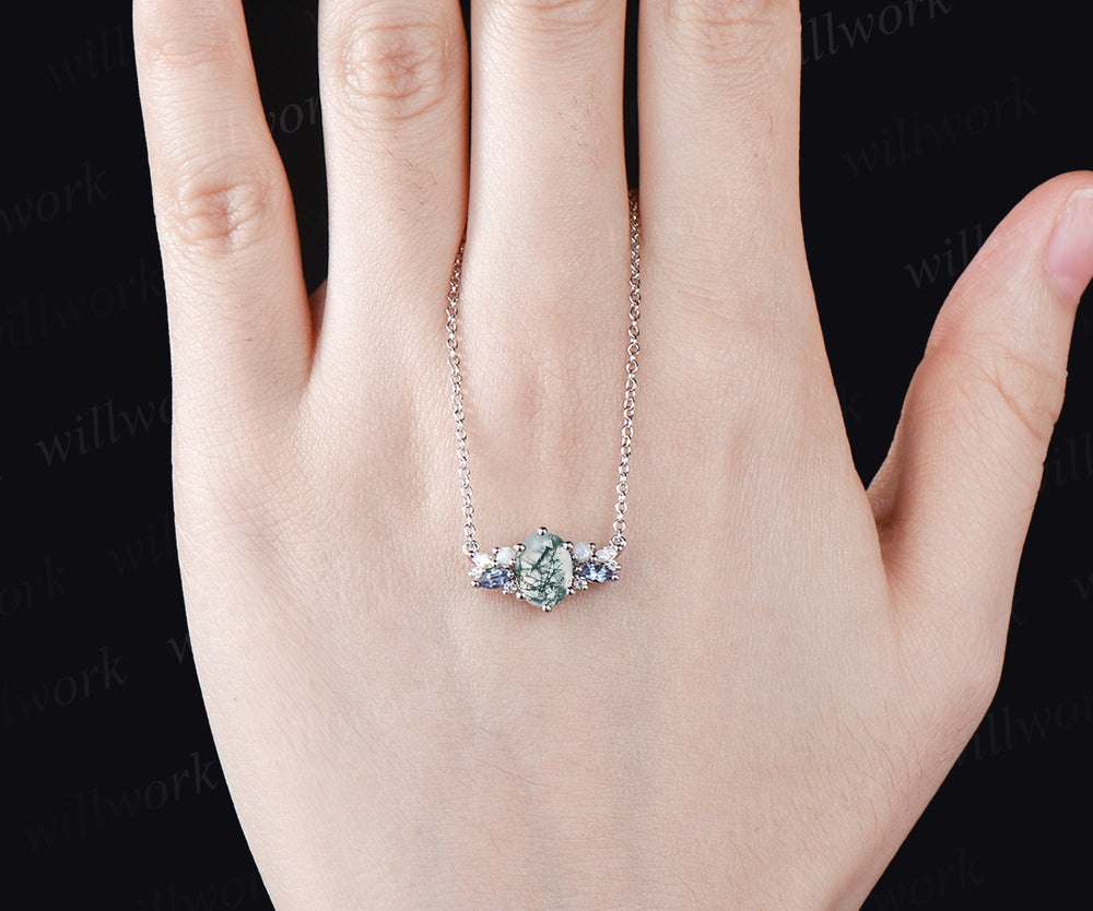 Oval moss agate dainty pendant necklace cluster alexandrite opal pendant sterling silver white gold necklace gifts for women