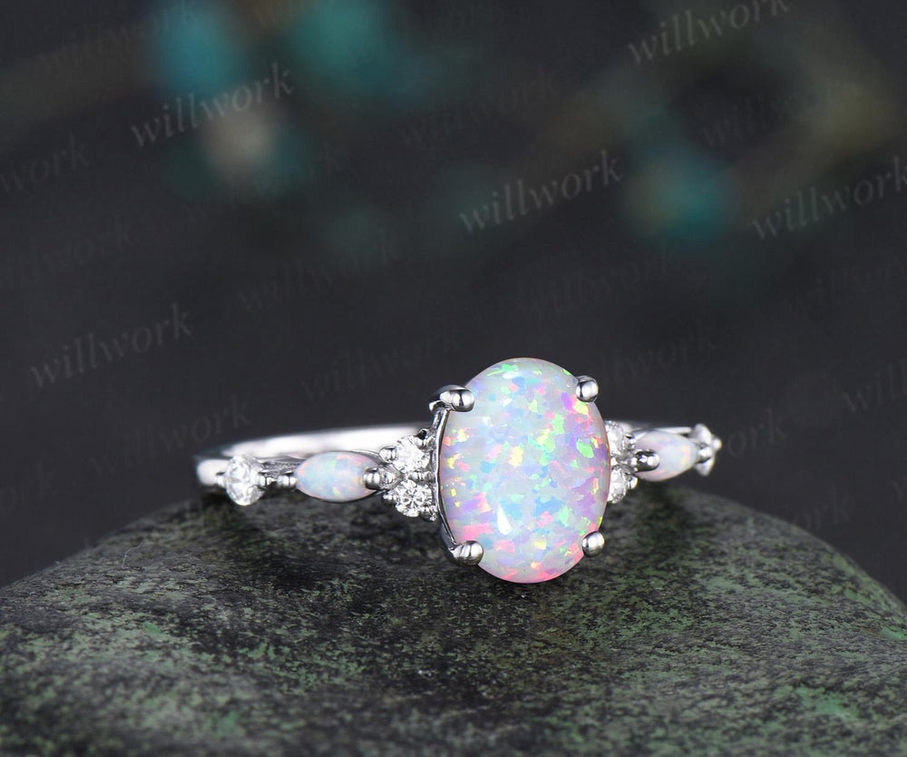Oval opal engagement ring 14k white gold fire opal diamond wedding ring women October birthstone ring women jewelry