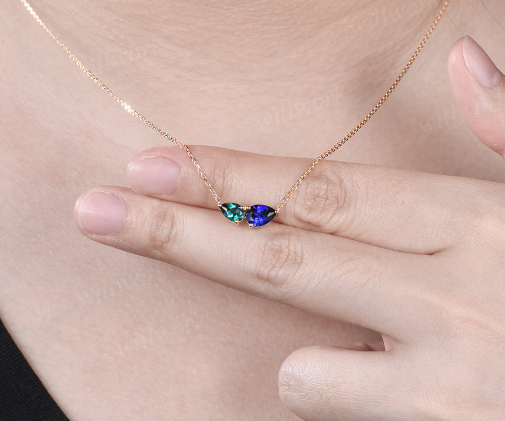 Pear cut emerald sapphire pendant necklace toi et moi necklace minimalist two stones pendant for couple bff